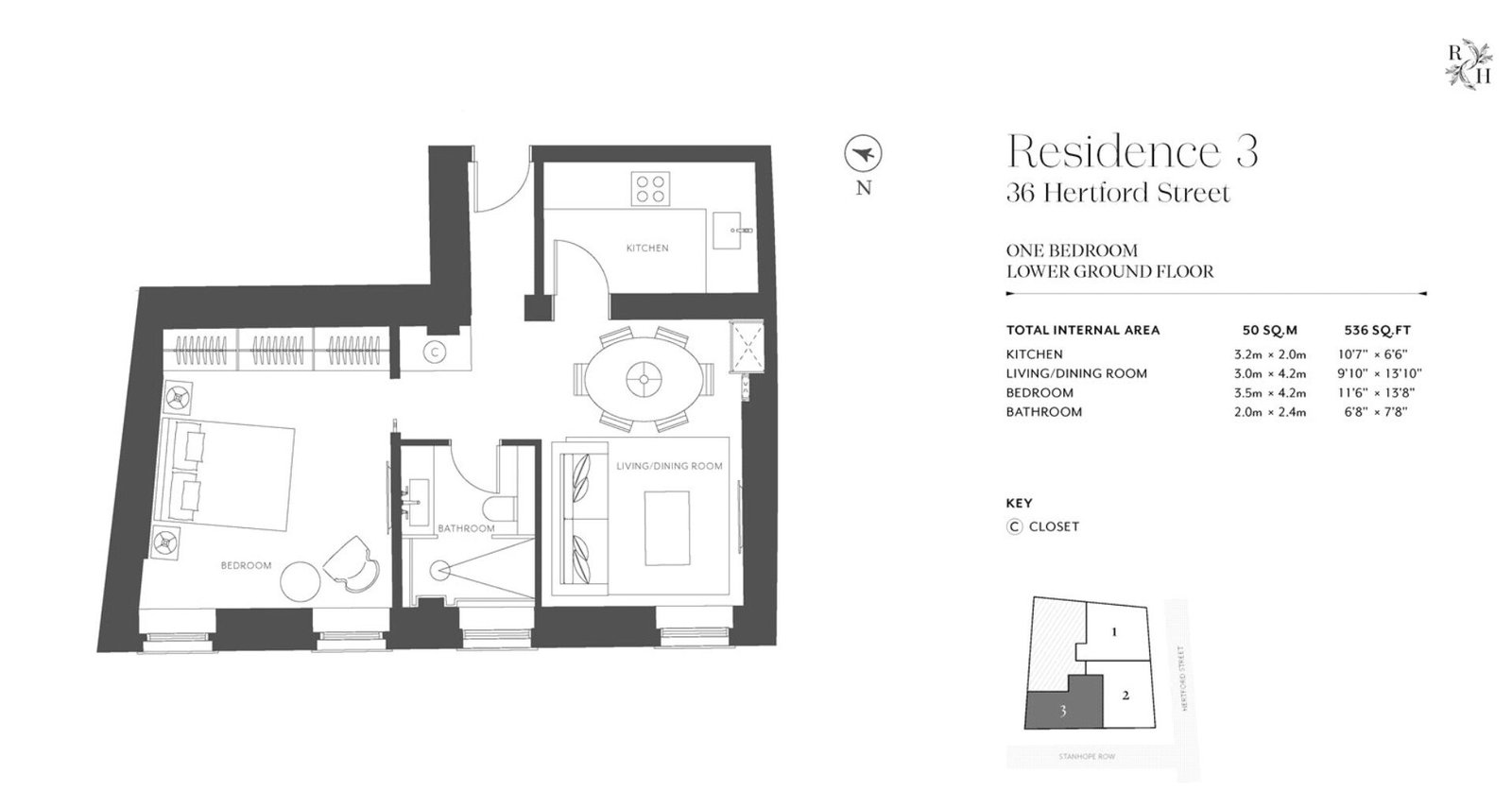 Floor Plan Description (Short):This thoughtfully designed one-bedroom residence is set within Hertford Street Residences in the heart of London, offering approximately 536 sq ft of refined internal space. Positioned on the lower ground level, the layout maximises both privacy and comfort, with a well-proportioned open-plan living and dining area that seamlessly connects to a contemporary kitchen finished with marble worktops and integrated appliances. The overall design focuses on clean lines and elegant detailing, creating a calm and sophisticated living environment.The bedroom is quietly positioned to enhance a sense of retreat, complemented by a luxurious bathroom featuring natural stone finishes and underfloor heating. Despite its boutique scale, the apartment offers a balanced layout suitable for both everyday living and city stays. Residents benefit from access to five-star hotel-style services, including concierge and nearby dining experiences, all set within the prestigious village atmosphere of Mayfair, just moments from green spaces, boutique shops and renowned restaurants.