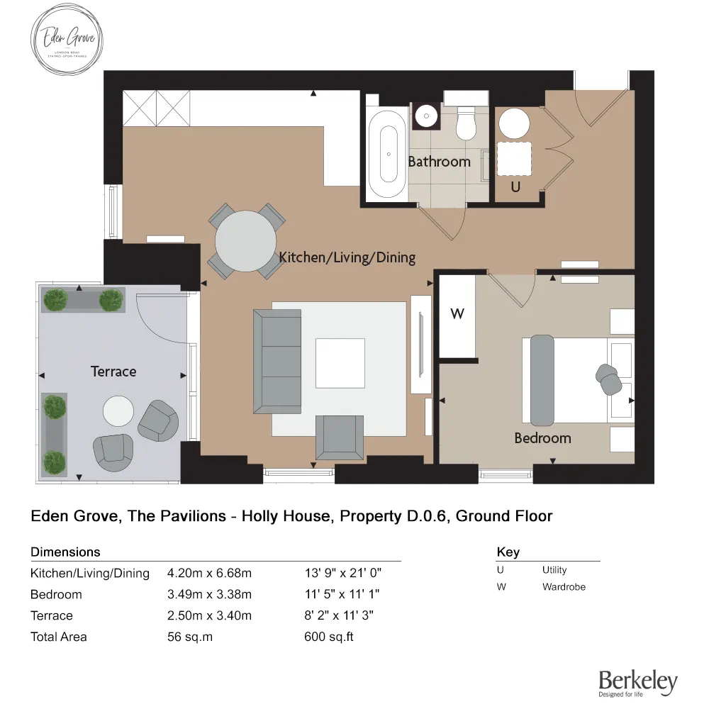1 bedroom apartment floor plan in Eden Grove Staines upon Thames TW18 4AB located on the ground floor with a south west aspect, approximately 600 sq ft, featuring an open plan living area, modern kitchen layout, a well proportioned bedroom and a private terrace designed for comfortable indoor and outdoor modern living.