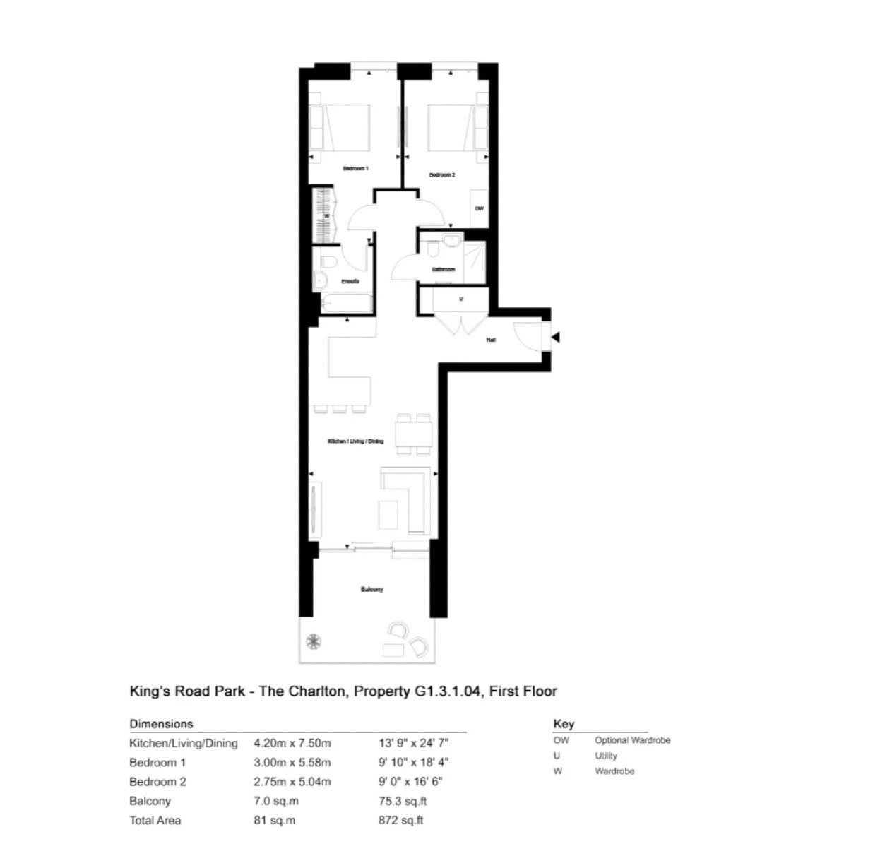 2 bedroom apartment floor plan in Kings Road Park Chelsea London located on the 1st floor with a south west aspect, approximately 775 sq ft, featuring an open plan living area, modern kitchen layout and two well proportioned bedrooms with two bathrooms designed for comfortable modern living.