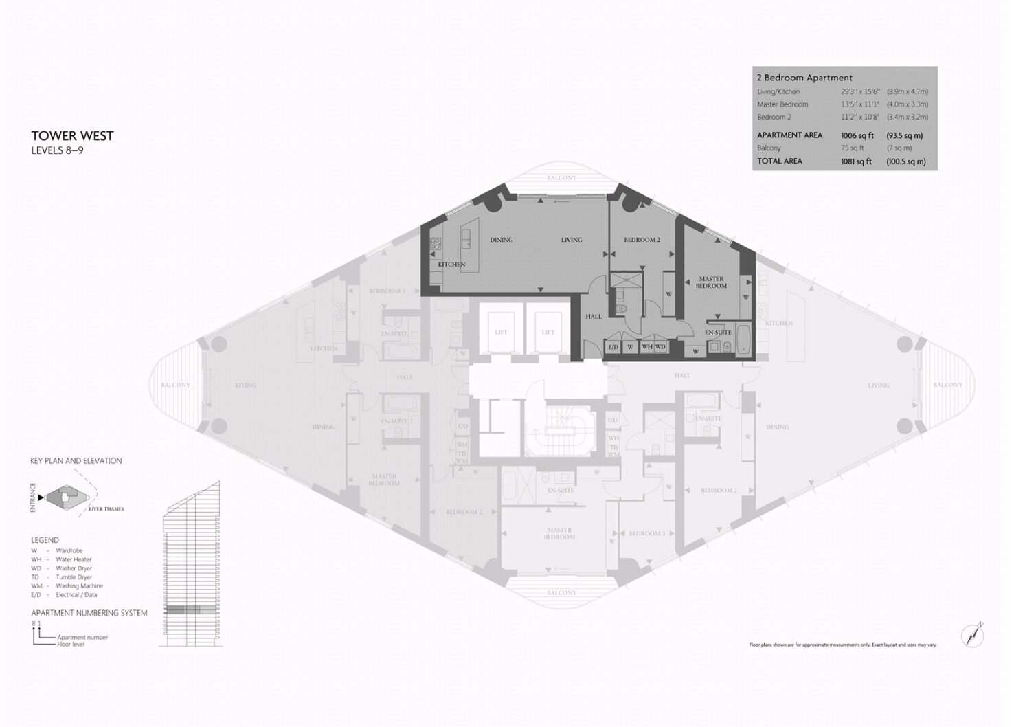 This well-proportioned two-bedroom apartment in London extends to approximately 1,006 sq ft and is situated on the ninth floor, offering elevated views towards the River Thames and surrounding skyline. The layout centres around a spacious open-plan reception and dining area, seamlessly connected to a contemporary kitchen, creating a bright and functional living space enhanced by large windows and access to a private balcony.Both bedrooms are thoughtfully arranged to ensure comfort and privacy, with the principal bedroom benefiting from an en-suite bathroom, while the second bedroom is served by a separate bathroom. The overall design balances practicality with modern living, providing clearly defined areas for relaxation and entertaining. Positioned within a prestigious riverside setting, the apartment combines light, space, and views in a refined and highly desirable London location.