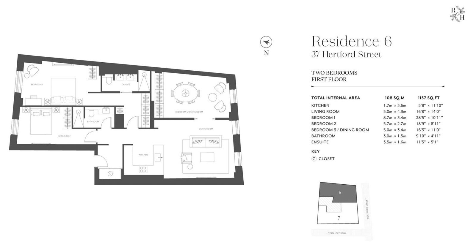 This beautifully proportioned two-bedroom residence is positioned on the first floor of Hertford Street Residences in the heart of London, offering approximately 1,157 sq ft of refined internal space. The layout is designed to enhance both flow and natural light, with a generous living and dining area that connects seamlessly to a contemporary kitchen finished with marble surfaces and high-specification integrated appliances. The overall arrangement creates an elegant and functional environment, ideal for both entertaining and everyday living.The two bedrooms are thoughtfully placed to provide privacy and comfort, with the principal bedroom benefiting from an en-suite bathroom, while the second bedroom is served by an additional bathroom finished in natural stone with underfloor heating. The apartment’s design reflects a balance of modern sophistication and timeless detailing, with bespoke joinery and high-quality materials throughout. Residents also enjoy access to concierge services and nearby five-star hotel-style amenities, all within Mayfair’s exclusive village setting, surrounded by world-class dining, boutique shopping and green parkland.