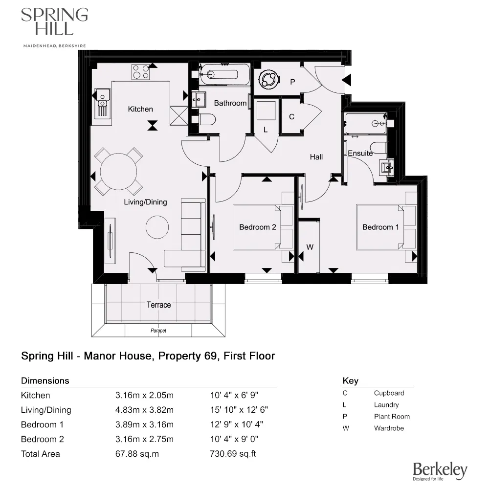 2 bedroom apartment floor plan in Spring Hill Maidenhead SL6 2QW located on the 1st floor, offering approximately 731 sq ft of internal space. The layout includes a well-designed open plan living and kitchen area, two comfortable bedrooms and two modern bathrooms, creating a practical and stylish home with easy access to central London via excellent transport links.
