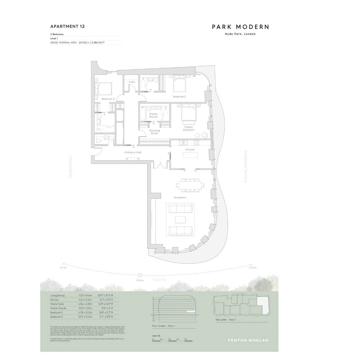 This exceptional three-bedroom apartment is set on the first floor of Park Modern in London, offering approximately 2,386 sq ft of beautifully designed lateral living space. The layout is thoughtfully arranged to maximise light and flow, with expansive floor-to-ceiling glazing creating a seamless connection between the interior and the surrounding park views. The main living and dining area is spacious and elegant, ideal for both entertaining and relaxed day-to-day living, complemented by a bespoke kitchen finished to the highest standard with integrated Gaggenau appliances.Each of the three bedrooms is generously proportioned, with the principal suite offering a private en-suite bathroom and a sense of calm overlooking the greenery. The additional bedrooms are equally refined, supported by high-spec bathrooms and ample storage throughout. Positioned with a south-east aspect, the apartment enjoys natural light throughout the day, enhancing the feeling of openness and luxury. Residents benefit from a full lifestyle offering including concierge, valet parking, spa, gym, swimming pool and cinema, creating a complete living experience in one of London’s most prestigious park-side locations.