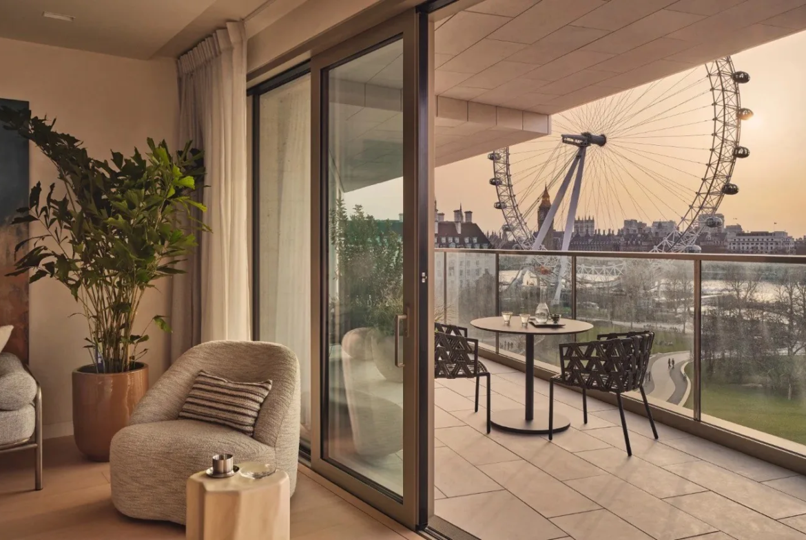 Extending to approximately 2,185 sq ft, this three-bedroom apartment offers generous lateral living space complemented by floor-to-ceiling windows and a private balcony, allowing natural light to flood the interiors while framing views across the Thames and London skyline, including Big Ben and the London Eye.