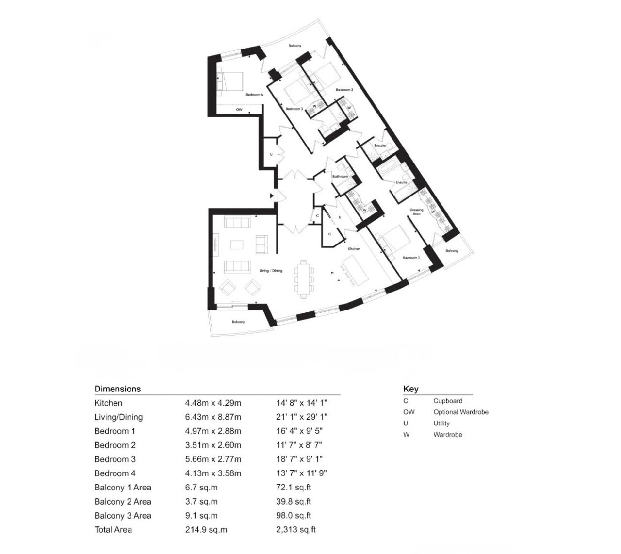 Each penthouse features a large open plan living and dining area, designed to maximise natural light and enhance the sense of space through floor to ceiling windows. The interiors are finished to a high standard, with contemporary kitchens fully fitted with integrated appliances and elegant detailing throughout.