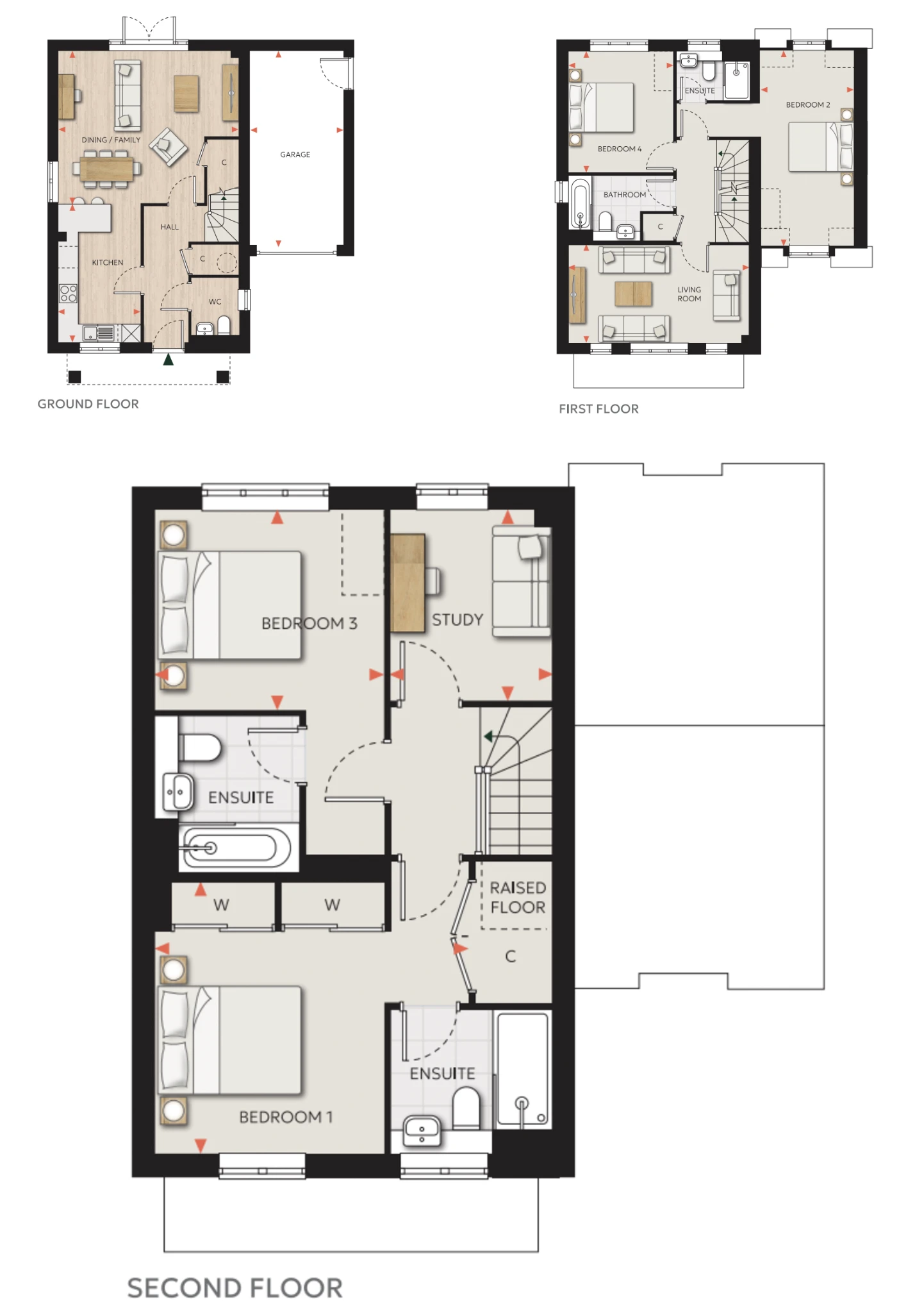 4 bedroom detached house floor plan in Milton Keynes offering approximately 1,828 sq ft of internal living space across multiple floors. The ground level features a spacious open-plan kitchen, dining and family area with direct garden access, alongside additional storage and a WC. A separate living room positioned on the first floor provides enhanced privacy and natural light. The upper levels include four well-proportioned bedrooms, most with en-suite bathrooms, along with a family bathroom and additional storage, creating a flexible layout ideal for modern family living.