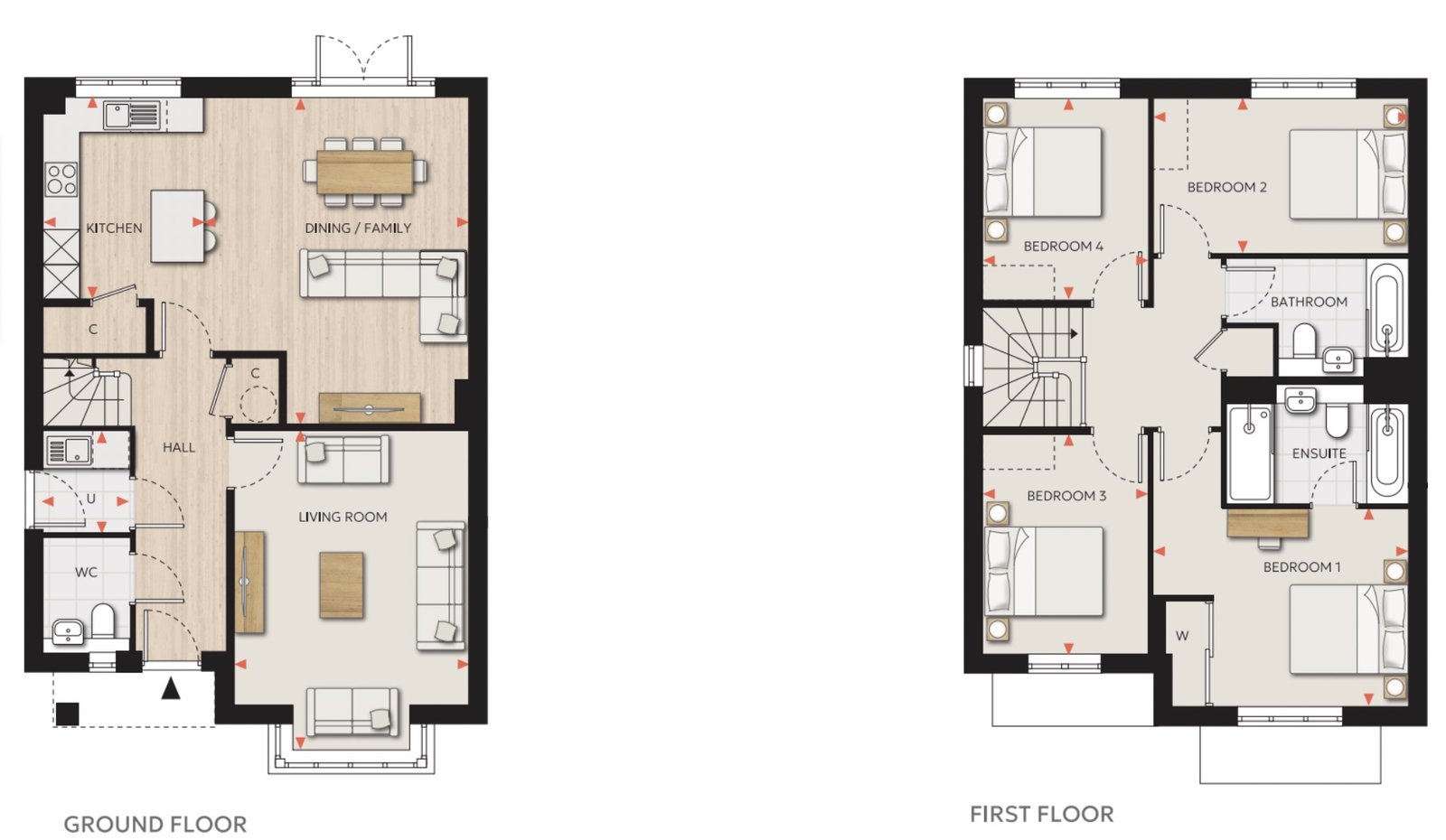 4 bedroom detached house floor plan in Milton Keynes offering approximately 1,585 sq ft of internal space. The layout includes a spacious open-plan kitchen, dining and family area with direct access to the garden, alongside a separate living room with bay windows. Additional ground floor features include a utility room, storage space, and a WC. The upper floor provides four well-proportioned bedrooms, including a main bedroom with en-suite, complemented by a modern family bathroom, creating a practical and comfortable layout for family living.